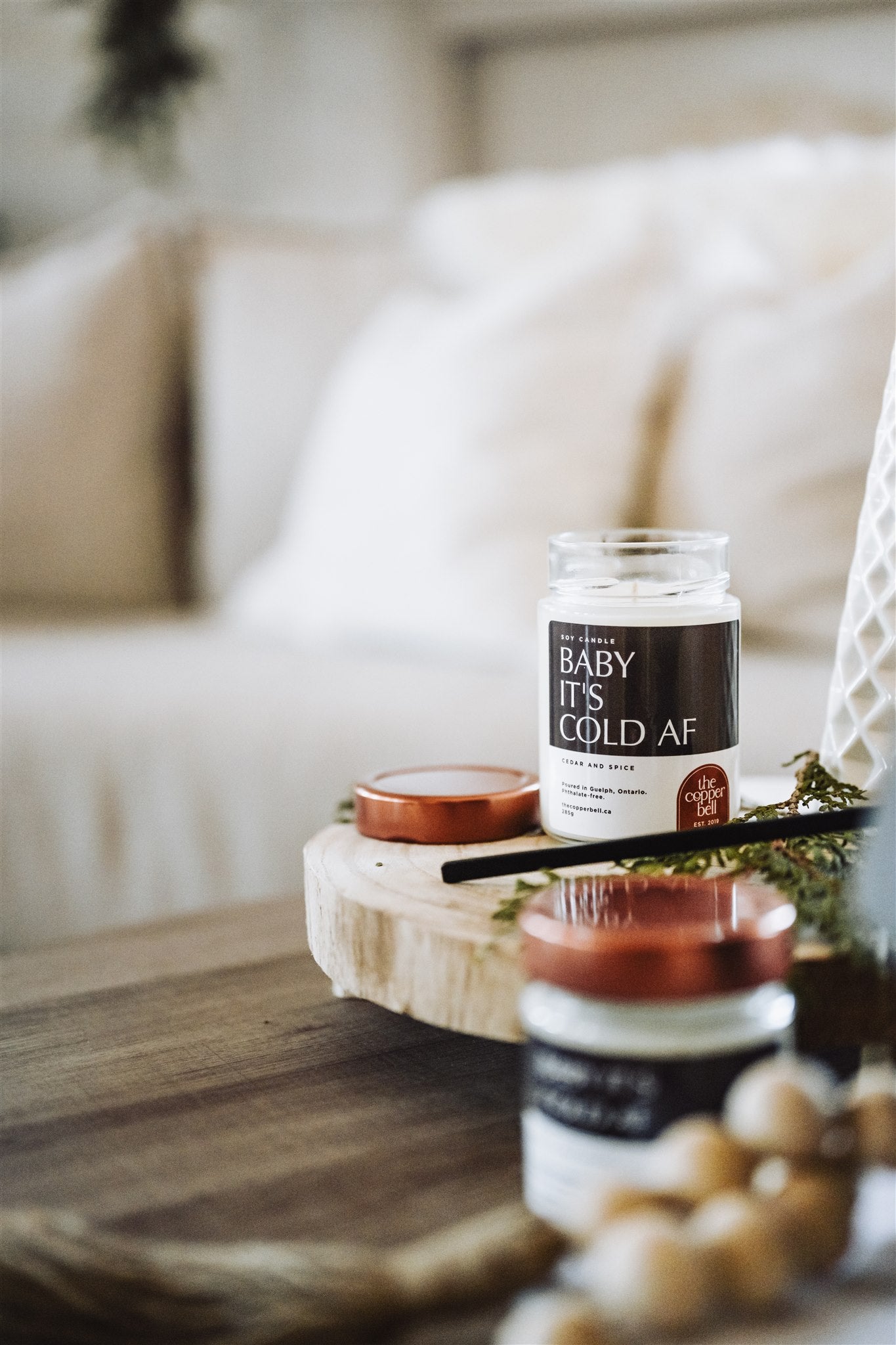 This candle smells like cedar and spice. You'll love the notes of cinnamon and cedar wood that bring the outdoors inside when it's cold af. Stay inside, stay cozy.